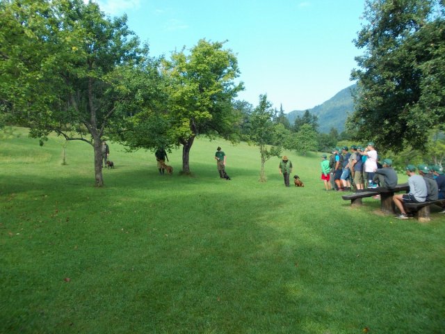 Zadnji dan je bil namenjen lovski kinologiji in streljanju z malokalibrsko puško na tarčo srnjaka. Po zajtrku smo se s predstavniki lovsko kinološkega društva Celje dobili na lovskem domu. Najprej so se seznanili z lovsko kinologijo, kjer jim je kinološki sodnik, inštruktor šolanja lovskih psov in predsednik LKD Celje Šumak Janez predstavil najpomembnejše vrste lovskih psov po pasemskih skupinah in njihov namen v delu. Nato so prisotni vodniki lovskih psov Vinko Otorepec, Dejan Janežič, Jože Vasle, ter Janez Šumak s svojimi štirinožnimi tovariši demonstrirali še nekaj vaj iz šole poslušnosti v LKD Celje po programu VP1 in VP2. Na koncu pa je sledil še praktični »šolski« prikaz dela lovskega psa po krvni sledi, ki ga je s svojo nemško prepeličarko Žiris uspešno izvedel vodnik Otorepec Vinko. Tandem je ob komentiranju Janeza Šumaka uspešno po sledeh našel obstreljeno, že mrtvo srno. Tako je bilo udeležencem mladinskega tabora predstavljeno tudi krvosledništvo, kot plemenita pomoč lovcem pri iskanju oz. zasledovanju in skrajšanju muk obstreljene divjadi.